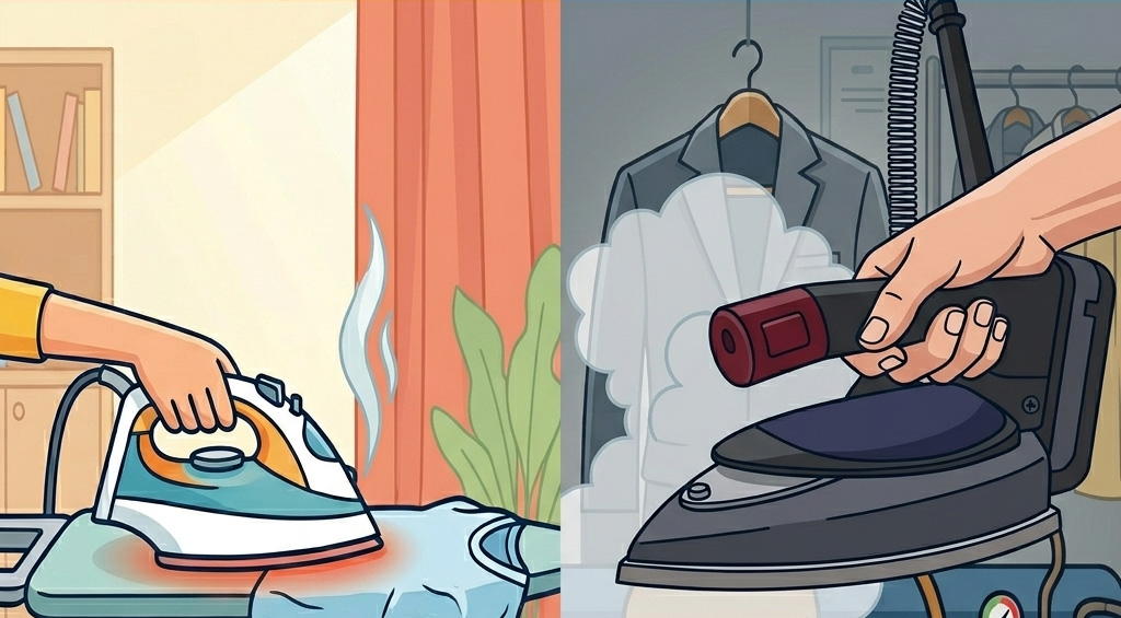 家庭用アイロンと業務用アイロンの最も大きな違いは、「熱源と蒸気の力」にあります。