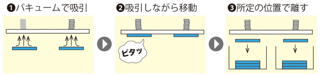プレス後、自動的に吸引され順序よく積み重ねられます。